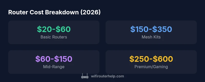 As of 2026, the total cost to equip a home with a WiFi router ranges widely from about $20 for basic models to $600 for premium mesh systems or gaming routers. For most households, budget categories cluster around basic ($20-$60), mid-range ($60-$150), and mesh or premium ($150-$600). Prices vary by features, warranty, and regional availability.