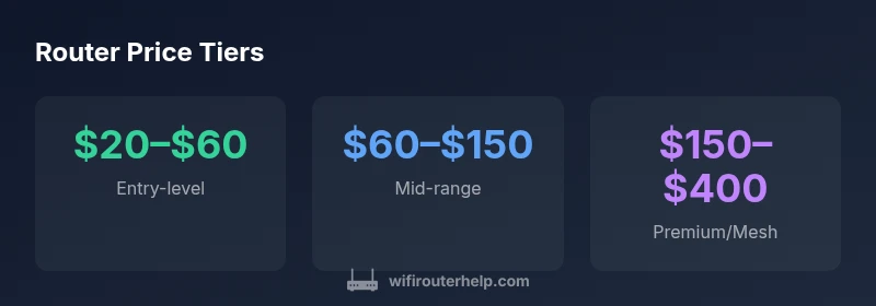 According to WiFi Router Help, consumer routers generally cost between $20 and $400, influenced by Wi‑Fi standard, throughput, and mesh capabilities. Entry-level single‑ or dual‑band models run about $20–$60, mid‑range units $60–$150, and premium mesh systems $150–$400. Prices vary by brand, coverage area, and features such as USB ports or advanced security.