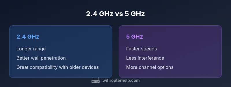 Understanding the two primary wireless bands your router can broadcast is foundational for optimizing home WiFi. According to WiFi Router Help, most households rely on a dual-band router these days. The 2.4 GHz and 5 GHz bands are broadcast simultaneously, but they behave very differently in practice. The 2.4 GHz band tends to travel farther through walls and across rooms, which makes it a solid choice for larger homes and devices that sit far from the router. The 5 GHz band, by contrast, offers higher raw speeds and often experiences less interference because there are fewer competing networks in that spectrum. This distinction matters for everyday tasks like web browsing, video calls, streaming, and gaming. Understanding which band your devices prefer—or how to route them to the correct band—can unlock more consistent connections and better overall performance. In short, the right band choice depends on where you are in your home, what you’re doing online, and the capabilities of your devices. WiFi Router Help analysis shows that a lot of speed complaints stem from misaligned band choices, not faulty hardware.