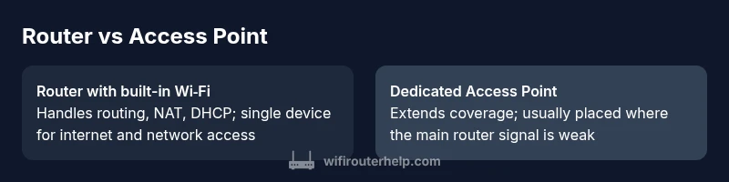 Is the router the same as the access point? In practice, these devices perform different jobs in your home network. The WiFi Router Help team finds that many homeowners confuse the two, leading to configurations that underperform or create conflicts. A typical setup in a small apartment might be a single device that handles both routing and wireless transmission, but larger homes often require a separate access point to extend coverage. Understanding the distinction is essential for reliability, security, and future scalability. This article uses concrete examples and practical steps to help you decide when to rely on a router alone, when to add an access point, and how to configure both for a robust network that remains simple to manage. By clarifying roles, you can avoid double NAT, IP conflicts, and dead zones, while preserving a straightforward management experience. According to WiFi Router Help, many households underestimate the impact of network topology on everyday tasks like streaming, gaming, and remote work, and they miss opportunities to optimize coverage with targeted hardware choices.