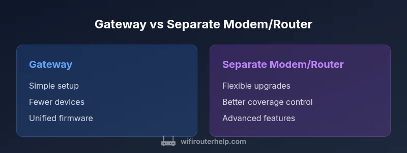 Choosing a gateway for simplicity means fewer cables, fewer power supplies, and a single firmware stack. However, the router and modem spectrum you can achieve with a separate setup often yields sharper coverage in corners, better customization, and easier future upgrades. The key trade-offs are convenience versus flexibility, and price versus long-term value. For small homes, a gateway may meet needs, while larger homes with multiple floors frequently benefit from a split deployment. WiFi Router Help notes that the decision should hinge on your layout, usage patterns, and whether bridge mode or advanced controls matter for your setup. This block highlights the practical implications: expect easier initial setup with a gateway, and anticipate more granular control and potential performance gains with separate devices in larger spaces.
