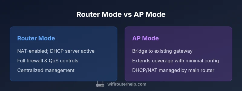 Understanding the difference between router mode and AP mode is essential for any home network. The choice shapes how devices obtain IP addresses, how traffic is routed, and how security rules apply across every connected device. According to WiFi Router Help, the decision hinges on whether you want a single gateway that manages everything or a clean bridge that simply extends coverage. The WiFi Router Help team found that most households benefit from starting with the mode that aligns with their primary goal: control and security, or seamless coverage. In this guide, we’ll unpack the two modes, explain practical setups, and provide a clear decision framework using real-world scenarios.