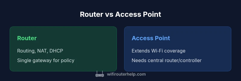 In home networking, a router is the central gateway that links your local network to the internet and manages IP addressing within your house. It combines routing logic, a DHCP server, NAT to translate addresses, and firewall protections. An access point (AP) is a dedicated Wi-Fi radio that attaches to an existing network to extend wireless coverage. When you compare router versus access point, it’s important to separate the device’s core functions from how it is deployed. According to WiFi Router Help, the most common confusion is treating an AP as a second router; in reality an AP should be used to grow coverage while preserving the primary network rules set by your router. Understanding these roles helps you design a network that scales without creating conflicts or double-NAT situations. In practical terms, think of the router as the brain and gatekeeper of the network, while an AP is the friendly extender that reaches further rooms or floors.