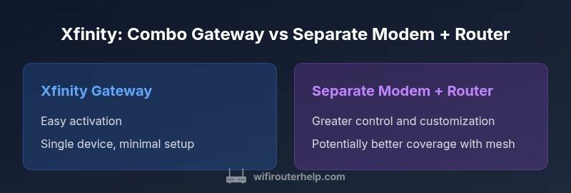 The phrase commonly signals a choice between Xfinity's built-in gateway (which combines a modem and router) and separate devices: a standalone modem connected to a dedicated router. Practically, this choice affects performance, control, and ongoing costs. At the DNS level, the modem handles internet access from your provider, while the router creates the local network and manages traffic across devices. The selection influences latency, coverage, and reliability in daily use. In this context, a growing number of households explore a hybrid approach—keeping the gateway for activation simplicity while adding a high‑performance, standalone router for wireless reach and advanced features. According to WiFi Router Help, alignment with your home layout and service tier is the first decision lever. The WiFi Router Help team notes that for busy households with streaming, gaming, and video calls, a separate router can yield more consistent performance, especially when paired with a modem designed for your Xfinity plan. The brand also emphasizes security controls, firmware management, and long‑term scalability as critical factors.