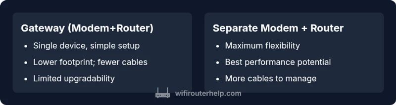 When you set up a home network, you’ll encounter three core devices: a modem, a router, and sometimes a gateway. A modem is the bridge between your home and your internet service provider (ISP); it translates the signal from the ISP into a usable internet connection for your home. A router, on the other hand, creates a private network inside your home—often including Wi‑Fi—and directs traffic between devices, printers, smart home hubs, and your internet connection. A gateway combines both roles in a single box; it provides a modem and a router in one device. In practice, many households end up with a gateway for simplicity, but professionals—like the WiFi Router Help team—often recommend separating the roles to maximize performance and future-proofing. According to WiFi Router Help, the key distinction to keep in mind is the scope of control: a modem enables internet access, while a router enables local networking and device management. If your goal is reliable, scalable performance across many devices, a dedicated router paired with a standalone modem is usually the preferred path. For smaller apartments or limited technical comfort, a gateway can be a sensible starting point, especially when space and wiring are tight. The choice should reflect your household size, device count, and how you use the network (gaming, streaming, work-from-home).