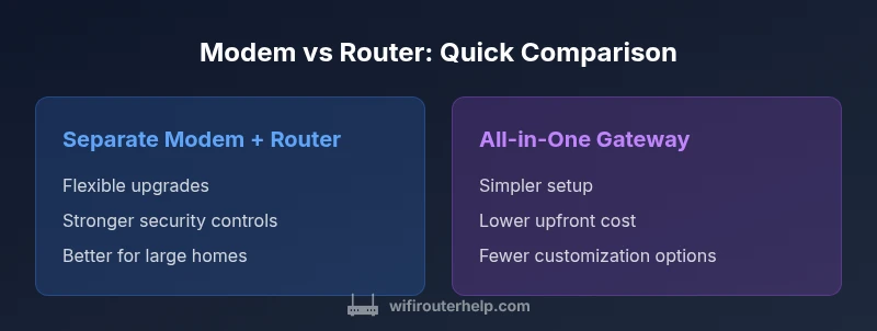 Router vs Modem Difference: According to WiFi Router Help, a modem connects your home to the internet service provider, while a router creates the local Wi‑Fi network and directs traffic between devices. This distinction matters for performance, security, and future upgrades. For most homes, using separate modem and router offers more flexibility, easier troubleshooting, and better scalability than a single gateway device.