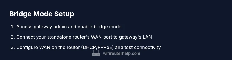 Using a dedicated router without a built-in modem means you rely on a gateway or ONT provided by your ISP in bridge mode, passing the internet signal to your own device. According to WiFi Router Help, this approach can improve control, security, and performance by eliminating double NAT and giving you full features of your own router. Start by confirming your ISP supports bridge mode or a pure bridge connection, gathering your router's login credentials, and choosing a compatible WAN connection type (DHCP or PPPoE). Then bridge the gateway and connect your standalone router to the WAN port. Be sure to save settings, reboot devices, and test connectivity before proceeding carefully. Note that not all ISPs or gateways allow bridge mode, and some managed services require you to keep the gateway's router active for voice services or IPTV. If you can't enable bridge mode, you may still use a pure router by placing the gateway in DMZ mode, but this can expose devices to the internet and create security concerns.
