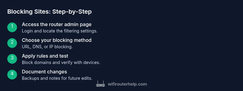Here’s how to block sites from router: this guide shows practical router-level filtering to block domains and keep your network productive. Start by logging into your router’s admin page, then choose a blocking method (URL filtering, DNS-based filtering, or IP blocking), and apply a test to verify results. You’ll need admin access, a target sites list, and a plan for exceptions.