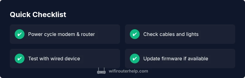 Begin with the basics: ensure power, confirm the modem is online, and verify the WAN connection. A simple restart often clears glitches. If the problem persists, proceed through the diagnostic flow.