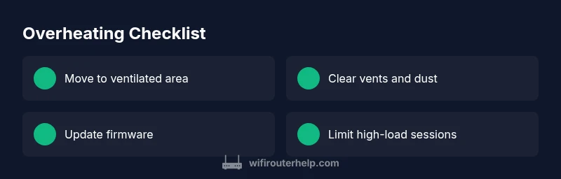 Overheating is usually caused by poor ventilation, blocked vents, or a heavy device load. Start with airflow improvements, update firmware, and perform a reboot. If the temperature remains high, consider reducing load and contact support for a deeper check.