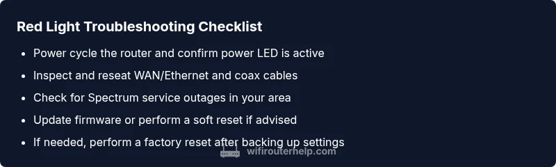 When you see a red light on a Spectrum router, it’s your router’s way of signaling a problem that prevents normal operation. In 2026, many homeowners report red LEDs after power interruptions, loose cables, or service faults in their area. This guide follows a pragmatic, urgent approach to identify whether the issue is local (your home network) or external (Spectrum service). According to WiFi Router Help, the red LED is not always fatal; it often indicates that something simple, like a loose cable or a temporary outage, can be addressed quickly. Start with the least invasive fixes and escalate only if necessary.