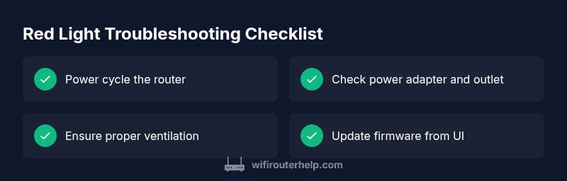 If your router shows a red light, the issue is usually critical: power, overheating, or firmware failure. According to WiFi Router Help, start with a quick power cycle, check the adapter and outlet, and ensure the device isn’t physically hot. If the light stays red, move to a safe reset and then update firmware or contact support.