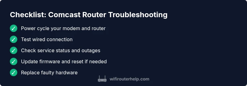 Comcast router issues are most often caused by a local network problem or outdated firmware. First, power cycle the modem and router, then check for service outages. If Wi-Fi remains unreliable, test with a wired connection, reset the router to factory settings, and update firmware. If problems persist, contact Comcast support for help.