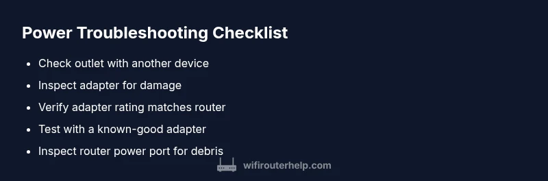 Power is the lifeblood of a home router. When the device has no power, you can't access Wi‑Fi, stream, or manage settings. According to WiFi Router Help, stable voltage is essential for the CPU, memory, radios, and the startup circuits to initialize during boot. In practice, most no-power issues trace back to three points: the outlet, the power adapter, or the router’s power port. Environmental factors such as a loose plug, flipped surge protector, or cold room can also cause intermittent power delivery. Understanding where the fault lies helps you act quickly and safely, reducing downtime for your smart home. This guide sets up a practical framework: start with simple checks, confirm ratings, and move methodically to more involved steps if the device remains dark. Throughout, avoid opening the router unless you’re trained, and always unplug before inspecting any components. By following a cautious, methodical approach, you minimize risk and maximize your chances of a safe fix.