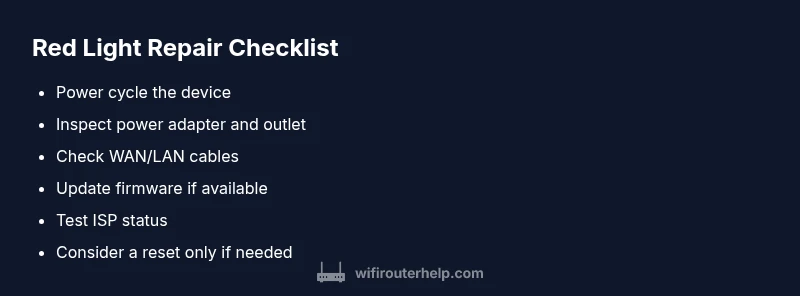 For those asking when router is red light, the quickest fix is to power cycle, check the power adapter, and confirm a solid WAN connection. The red LED usually signals a power or connectivity fault rather than a failing device. Start with basic checks like cables and outlets, then follow the diagnostic flow to resolve the issue quickly. If it persists, move into deeper troubleshooting.