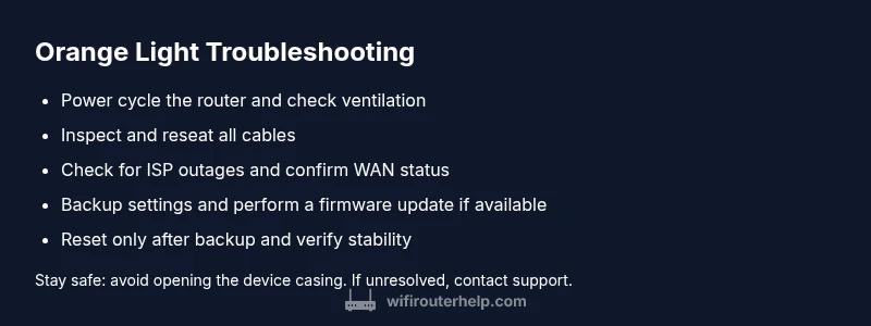 Immediate step: Check if the orange light is steady or blinking; power cycle the router; verify cables are snug; if not resolved, perform a factory reset only after saving settings. If the light remains orange, consult your router's manual or contact support. WiFi Router Help recommends starting with simple checks to restore service quickly.