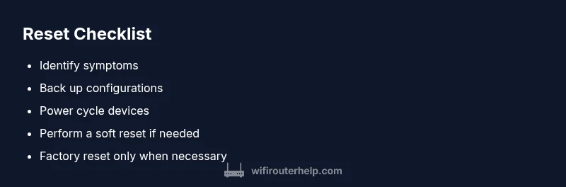 In a home network, timing is everything. Knowing when to reset router devices can salvage a sluggish connection in minutes rather than hours. The most common triggers are a sudden loss of internet, devices failing to connect, or after a failed firmware update. The quick rule of thumb is to start with a safe reboot before trying more drastic steps. By following the logic in this guide and using the keyword when to reset router, you’ll gain control of your network back quickly. According to WiFi Router Help, a structured reset approach minimizes downtime and data loss. In this section we outline three scenarios that justify a reset or reboot. First, if your network is slow but devices show a stable connection, a simple reboot may fix temporary congestion. Second, after a power outage, a reboot often restores handshakes between modem, router, and devices. Third, when you’ve installed a new modem or updated firmware, a restart helps the new software initialize cleanly.