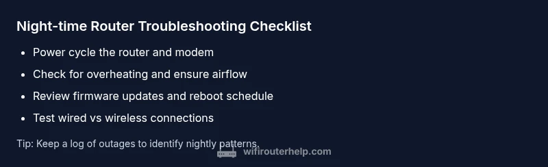 Why does my router stop working at night? The quickest fix is a power cycle, checking for overheating, and ensuring the modem is online. According to WiFi Router Help, night-time outages are often caused by automated updates, nightly maintenance, or thermal throttling. If the issue repeats, follow the diagnostic flow below for a step-by-step resolution.