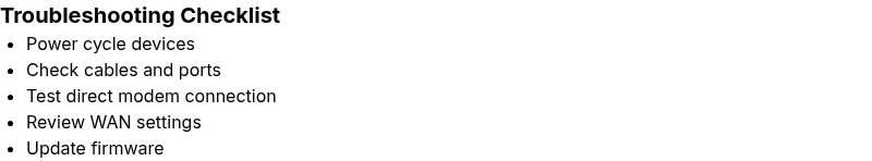 Start with a power cycle and cable check, then review WAN settings if needed.