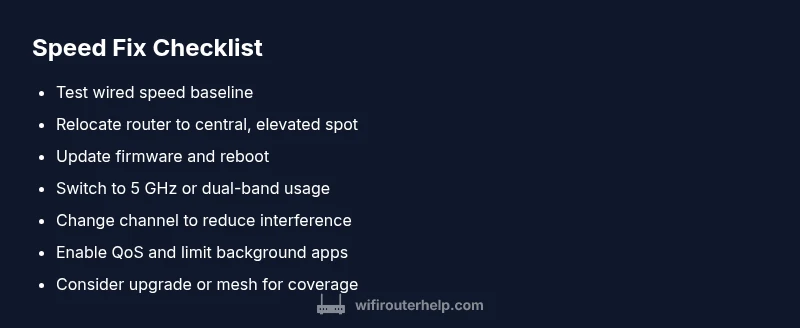Slow router speed almost always stems from interference, distance, outdated firmware, or misconfigured settings. Start with simple checks: move your router to a central, open location, reboot both router and modem, and test a wired speed. If speeds remain slow, update firmware and adjust channels before considering a hardware upgrade. WiFi Router Help outlines these steps as the fastest path to resolving why router speed is slow.